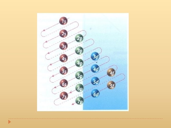 La manera de mostrar cómo se distribuyen los electrones en un átomo, es a través de la configuración electrónica. El orden en el que se van llenando los niveles de energía es: 1 s, 2 p, 3 s, 3 p, 4 s, 3 d, 4 p. El esquema de llenado de los orbitales atómicos, lo podemos tener utilizando la regla de la diagonal, para ello debes seguir atentamente la flecha del esquema comenzando en 1 s; siguiendo la flecha podrás ir completando los orbitales con los electrones en forma correcta.