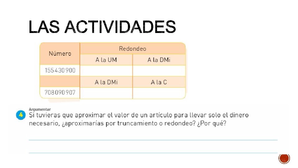 Número 4. 759. 254 Posición a la que se redondea DM Número redondeado 4. 760. 000 74. 789 C 74. 800 24. 379 UM 24. 000 12. 054. 169 UMi 12. 000 306. 789. 145 DMi 310. 000 159. 647. 403 UMi 160. 000