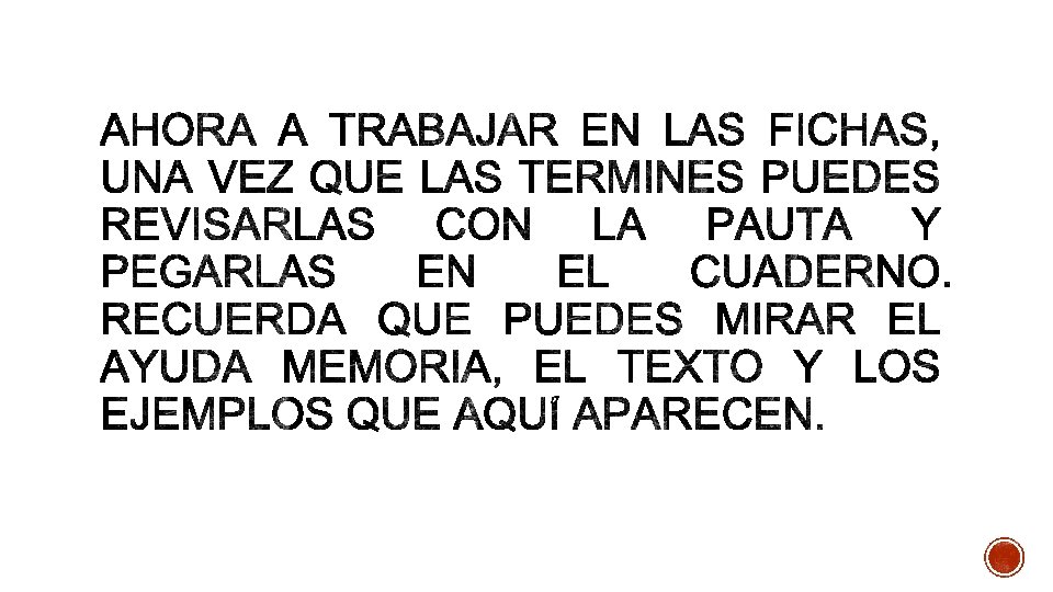 § Resuelve las fichas de trabajo 6 y pégalas en tu cuaderno. § Las podrás revisar con la pauta correspondiente. § Recuerda que cualquier duda la puedes revisar en esta presentación o en el ayuda memoria.