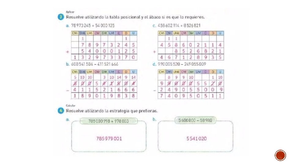 § En este caso “acercamos” el número a otro de acuerdo al valor posicional indicado y siguiendo algunas reglas, de este modo: § Queremos aproximar por redondeo el número 4. 758. 124 a la CM: § Identificamos la CM, en este caso 7 § Observamos la posición de la derecha, en este caso la DM Sí Se suma 1 al dígito de las CM Reemplazar con 0 los dígitos de las DM, UM, C, D y U Los dígitos de las CM y UMi quedan igual. ¿Es el dígito de la DM igual o mayor que 5? No El dígito de las CM no cambia Por lo tanto, 4. 758. 124 aproximado por redondeo a la CM resulta: 4. 800. 000