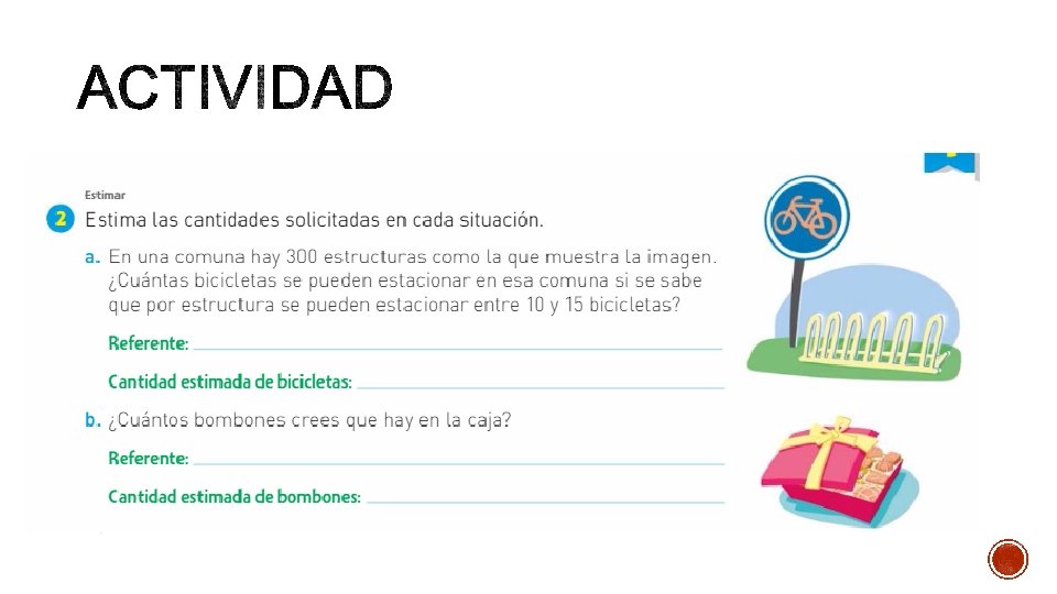 § Es dar un valor cercano a una cantidad que desconocemos o no podemos determinar con certeza. § Para estimar necesitamos usar un referente, en el caso del ejemplo, la caja de galletas. § El referente es aquello que tomo en consideración para poder determinar la cantidad aproximada de aquello que estoy buscando conocer.