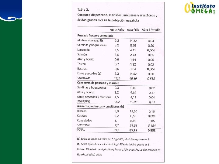 RECOMENDACIONES NUTRICIONALES EN LA INGESTA DE GRASA Ingesta de grasa 30 -35% de la energía dietética total Recomendación* (% de la energía) Saturados Monoinsaturados Poliinsaturados (w 6 y w 3) Relación w 6: w 3 7 -9 15 -18 7 -9 10: 1 - 5: 1 *Dr. Mataix, SENC.