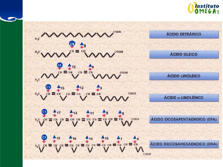 ¿QUÉ ENTENDEMOS POR GRASA INSATURADA? è Existen 3 tipos de grasas o ácidos grasos insaturados: Tipo Fuente Monoinsat. (oleico) Aceite de oliva Poliinsat. w-6 Aceite de girasol, maíz y soja Poliinsat. w-3 Productos origen marino