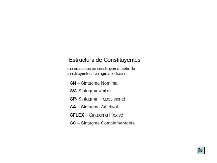 Características de una gramática correctamente construida • Adecuación externa las oraciones generadas deben concidir con los juicios de gramaticalidad de los hablantes • Adecuación de generalidad la gramática debe construirse de acuerdo con una teoría de la estructura lingüística (GU) los elementos son independientes de cualquier lengua particular • La teoría gramatical es necesariamente falseable y se desarrolla a partir de la revisión constante de sus postulados