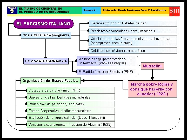 3. La llegada al poder de il “Duce”: Cambio de estrategia de il Duce: Transforma a sus grupos paramilitares en un partido político serio y formal. Mussolini funda en 1921 el Partido Nacional Fascista: Con un programa de gobierno de extrema derecha política. En octubre de 1922 el Duce organiza la “marcha sobre Roma” con miles de sus seguidores para obligar al rey Víctor Manuel III a entregarle el PODER TOTAL DEL GOBIERNO. Días más tarde, el rey le entrega el gobierno a Mussolini (1922).