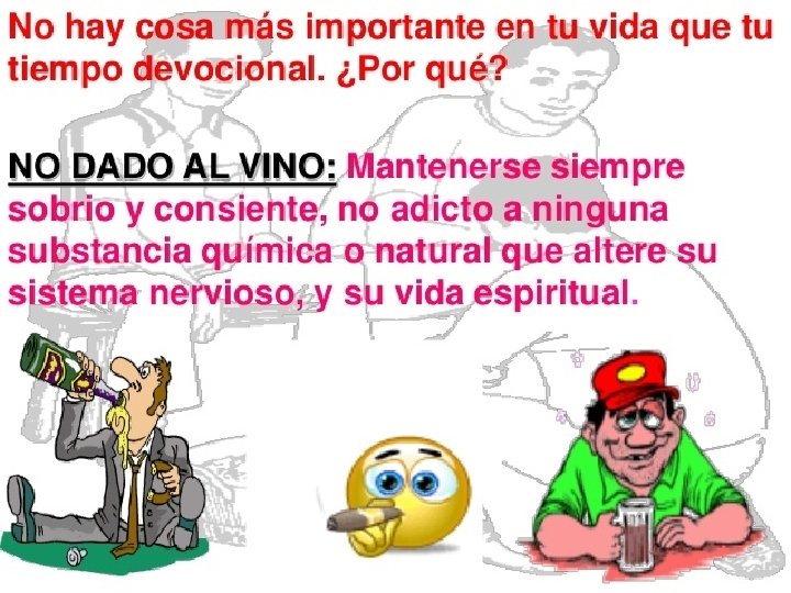 • No dado al vino- 3: 3. Que no sea esclavo del vino, Si esto fuera requisito exclusivamente solo para el anciano, entonces todos los cristianos tendrían derecho a emborracharse lo cual la Biblia no enseña. Ef. 5: 18; Rom. 13: 13. No debemos andar en Borracheras, no debemos ni ver al vino cuando rojea. Prov. 23: 31. No os embriaguéis con vino, en lo cual hay disolución; antes bien sed llenos del Espíritu, Andemos como de día, honestamente; no en glotonerías y borracheras, no en lujurias y lascivias, no en contiendas y envidia, No mires al vino cuando rojea, Cuando resplandece su color en la copa. Se entra suavemente;