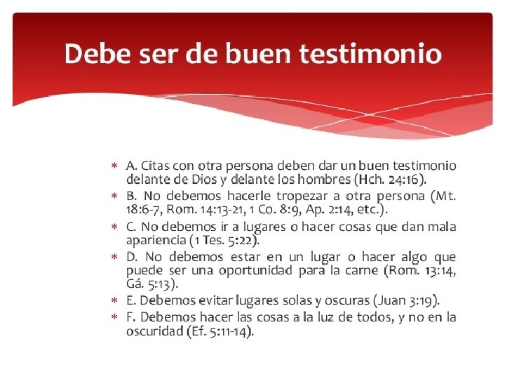 • Que tenga buen testimonio de los de afuera- 3: 7. Esto incluye la reputación que tiene en todas las relaciones con otros, con amigos de trabajo, vecinos, parientes, en tratos de negocios, situación con acreedores, si es buena paga o no, si es cumplido, buen esposo, buen padre, buen hermano, buen tío, buen suegro, buen trabajador, buen vecino, buen ciudadano, etc. El hermano con mala fama en cualquier aspecto de su vida diaria, no debe ni enseñar ni predicar, mucho menos ser anciano, porque tal persona mancha la iglesia que lo escoge como obispo. • Todos debemos ser luz en este mundo. Mat. 5: 14 -16. Todos tenemos que cumplir con este requisito no solo los ancianos. Vosotros sois la luz del mundo; una ciudad asentada sobre un monte no se puede esconder. Ni se enciende una luz y se pone debajo de un almud, sino sobre el candelero, y alumbra a todos los que están en casa. Así alumbre vuestra luz delante de los hombres, para que vean vuestras buenas obras, y glorifiquen a vuestro Padre que está en los cielos.