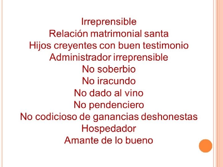 • Los ancianos deben ser irreprensible- 3: 2. Intachable, no expuesto a censura, sin represión. , impecable, incorruptible, íntegro lo más posible, porque ha de ser ejemplos a todos. Una persona visiblemente reprochable, criticable, tachable, deshonesta, no puede ni ser buen ejemplo ni ejercer buena influencia sobre otros. • Pero esta cualidad no solo se le pide a los ancianos sino a todo cristiano. I Cor. 1: 8; Fil. 1: 10; 2: 15; Col. 1: 22. Todos tenemos que ser irreprensible. el cual también os confirmará hasta el fin, para que seáis irreprensibles en el día de nuestro Señor Jesucristo. para que aprobéis lo mejor, a fin de que seáis sinceros e irreprensibles para el día de Cristo, para que seáis irreprensibles y sencillos, hijos de Dios sin mancha en medio de una generación maligna y perversa, en medio de la cual resplandecéis como luminares en el mundo; en su cuerpo de carne, por medio de la muerte, para presentaros santos y sin mancha e irreprensibles delante de él;