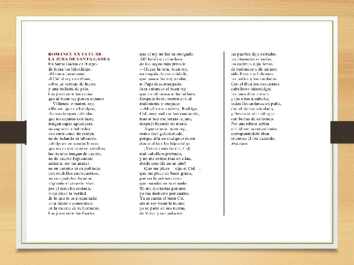 CLASIFICACIÓN DE LOS ROMANCES. 2. SEGÚN LOS TEMAS • • • Histórico-nacionales: • Proceden de los cantares de gesta castellanos. • Exaltan a sus héroes: Bernardo de Carpio, Fernán González, los infantes de Lara, el Cid… Novelescos y líricos: • Producto de la imaginación popular con temática variada: amor, venganza o sucesos misteriosos. Fronterizos y Moriscos: • Narran luchas fronterizas entre cristianos y musulmanes. Carolingios: • Centrados en la figura de Carlomagno y en personajes (don Roldán y doña Alda) y sucesos relacionados con él. Bretones: • Inspirados en la leyenda del rey Arturo y en los caballeros de la Tabla Redonda.