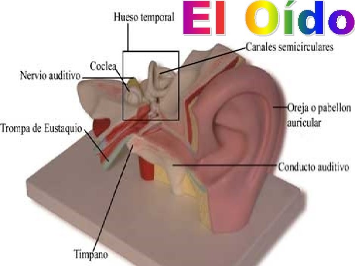 Los sentidos: el oído El oído nos informa de los sonidos que se producen a nuestro alrededor. Los oídos son los órganos del sentido del oído. En los oídos distinguimos: * Una parte que vemos: - Orejas. * Otras partes que no vemos: - Conducto auditivo. - Tímpano. - Huesecillos. - Caracol.