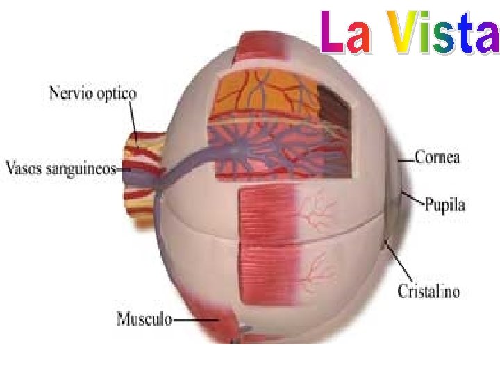 Los sentidos: la vista La vista nos informa del tamaño, la forma, el color, la posición, la distancia y la velocidad a la que se desplazan los objetos. Los ojos son los órganos de la vista. En los ojos distinguimos: * Partes que se encargan de protegerlos: - Párpados. - Pestañas. - Cejas. * Partes que se ocupan de la visión: - Pupila. - Iris. - Cristalino. - Retina.