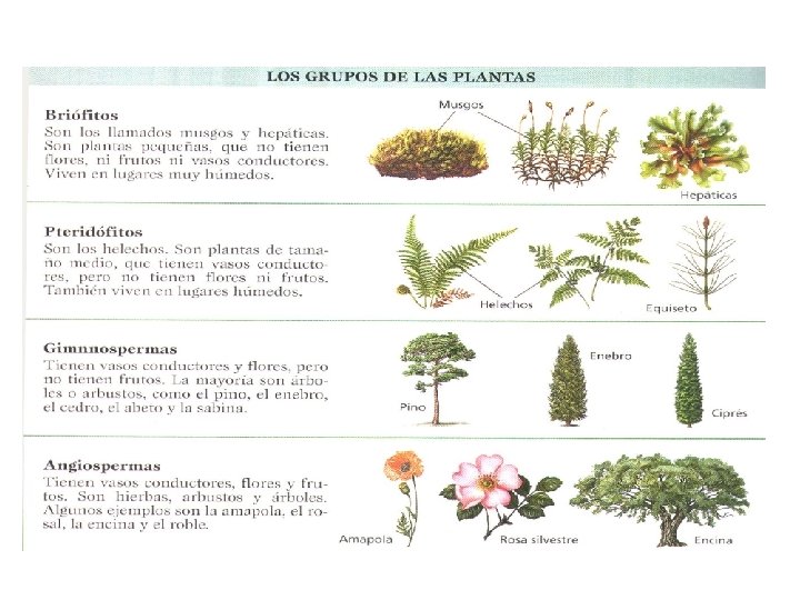PLANTAS • Son organismos eucariotas, pluricelulares y autótrofos. • Se diferencias cuatro grandes grupos de plantas: Los musgos Los helechos Las gimnospermas Las angiospermas