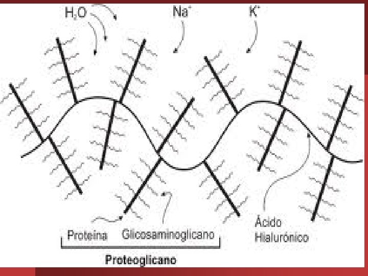 Glicosaminoglicanos y proteoglicanos • • Los glicosaminoglicanos son polisacáridos (o sea, hidratos de carbono, azúcares) complejos. Entre los màs abundantes: ácido hialurónico (es el de mayor tamaño y no se encuentra sulfatado), el condroitín sulfato, sulfato el dermatán sulfato, sulfato el heparán sulfato y el queratán sulfato al combinarse con proteínas, pasan a llamarse proteoglicanos. También reciben en general la denominación de "mucopolisacáridos".