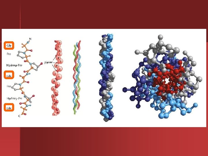 COLAGENA n Proteína en mayor cantidad, ¼ de proteína total. n Localización: piel, tendones, cartílagos, vasos sanguíneos, dientes, membranas basales, cornea, cuerpo vítreo, tejidos de sostén.