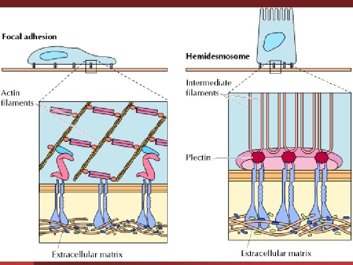 Distintos tipos de interacciones entre las integrinas y el citoesqueleto se encuentran en dos tipos de contactos célula-matriz: Las Adhesiones Focales : Anclan varios tipos celulares, incluyendo a los fibroblastos. Hemidesmosomas: Sitios de unión específica entre la integrina α 6β 4 se une a la laminina por lo que su función es anclar células epiteliales a la lámina basal.