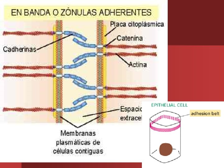 Las uniones de ADHERENCIA O ADHERENS están formadas por un cinturón de adhesión alrededor de cada célula (un haz contráctil de filamentos de actina subyacente se une a la membrana plasmática).