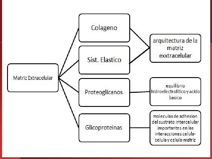 FUNCIONES DE LA MATRIZ EXTRACELULAR • • • Rellenar el espacio existente entre las células otorgando resistencia a la compresión y al estiramiento (estas propiedades decaen con el envejecimiento). Medio por donde llegan los nutrientes y se eliminan los desechos celulares (función que se encuentra alterada en la celulitis). Proveer a la cèlulas "puntos fijos" donde aferrarse. Espacio por donde migran las células cuando se desplazan de un punto a otro del organismo medio por el cual arriban a las células señales bioquímicas (por ejemplo, hormonas, citoquinas).