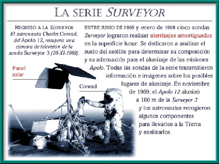 APOLLO 12 En noviembre de 1969 el APOLLO 12 llevó a cabo la segunda misión lunar. Tripulada por Conrad, Bean y Gordon, descendieron en el mar de las Tormentas, permaneciendo allí más de 31 horas. Dejaron material científico y caminaron hasta el Suveyor III, que había alunizado años antes, de donde recuperaron algunos objetos. Estuvieron 31, 5 horas sobre la superficie lunar y 89 horas en su órbita, completando 45 órbitas. Trajeron 34 kg de materiales. El módulo lunar fue impactado contra la Luna. Volvió a la Tierra el día 24, siendo sometidos los tripulantes a cuarentena. La precisión del alunizaje del Apolo 12 llevó a planear la posibilidad de que el Apolo 13 alunizara en un terreno más accidentado