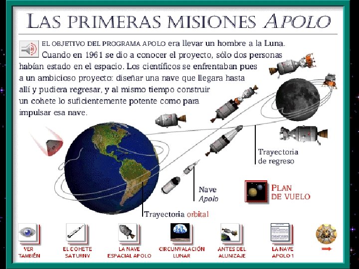 APOLLO 1 Seis meses mas tarde, al efectuar en tierra el primer ensayo tripulado del APOLLO 1, tuvo lugar el accidente que costó la vida a los astronautas Grissom, White y Chaffee y que puso de relieve lo inadecuado de la atmósfera artificial de la nave, así como la inseguridad de los sistemas eléctricos de la cápsula. Este accidente obligó a revisar por completo el Programa Apollo, produciéndose un considerable retraso. Ocho meses más tarde, se lanzó al espacio el Apollo 4, comprobándose el correcto funcionamiento de todos los sistemas. Antes de proceder al lanzamiento de un vuelo tripulado, se enviaron al espacio otras dos astronaves vacías, donde se experimentó la maniobrabilidad del Módulo Lunar y realizando el atraque del Modulo de Mando y de Servicio con el mismo. Las naves respondieron bien a todas las pruebas realizadas. Por fin, en octubre de 1968 tuvo lugar el primer vuelo tripulado del Programa