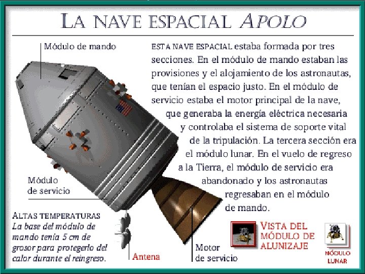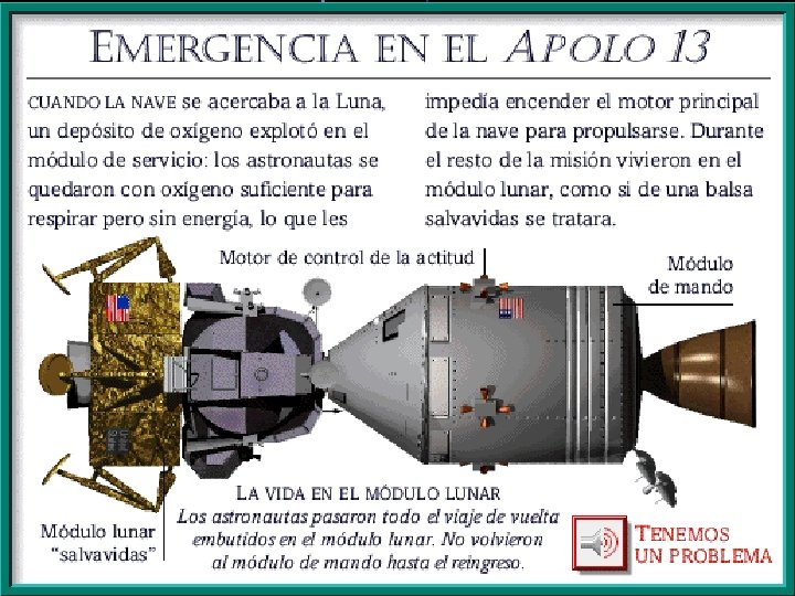 Nada más comenzar la segunda órbita, los astronautas de a bordo, Armstrong, Aldrin y Collins, volvieron a encender los motores de la tercera fase, situándose en la trayectoria lunar, a una velocidad de 39. 000 kilómetros por hora. En ese momento, realizaron la maniobra que separaría del resto de la nave al conjunto del Módulo de Mando y Módulo de Servicio, realizaron la maniobra de atraque con el Módulo Lunar y los tres juntos se alejaron en el espacio. El día 19 de julio, el APOLLO 11 entró en órbita lunar APOLLO 11 Por fin llegó el momento decisivo: el día 20 de julio de 1969, tras múltiples comprobaciones, el Águila, nombre con el que habían bautizado la LM, se separó del COLUMBIA (Nombre del Módulo de Mando). El encendido del motor de descenso funcionó perfectamente. Ya cerca de la superficie, se encendió una luz de alarma. indicando que algo no funcionaba bien en los ordenadores de a bordo. Esta alarma no correspondía a ninguno de los tipos de averías previstos; no había surgido jamás en los entrenamientos de tierra y parece ser que se debía al excesivo trabajo soportado por el ordenador. El Centro de Control analizó el problema y comunicó que podían continuar su descenso sin que peligrara su seguridad. En el momento de tocar suelo, el Centro de Control perdió el contacto por televisión con la nave a causa de una avería en el satélite de comunicaciones