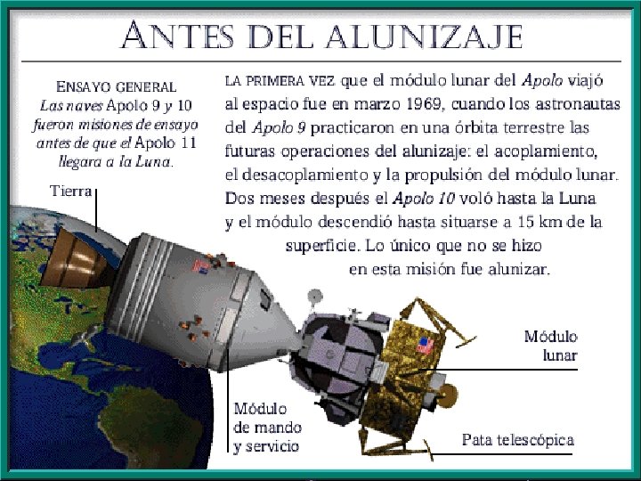 APOLLO 10 El Apollo 10, con Stafford, Cernan y Young, realizaron el ensayo dos meses después, con la diferencia de que esta vez lo realizaron en vuelo alrededor de la Luna y a solo quince kilómetros de su superficie. Estando ya en órbita lunar, Cernan y Stafford se trasladaron al módulo lunar y con él descendieron a una distancia de 15. 243 m de la superficie de la Luna. Después, en la fase de ascenso, realizaron con éxito las maniobras de aproximación y acoplamiento al módulo de comando. Estuvieron 61, 6 horas en órbita lunar, con 31 órbitas. Fue la primera transmisión en vivo y en color desde el espacio. Regresó a la Tierra el día 26, dejando el camino preparado para la llegada de los astronautas a la Luna