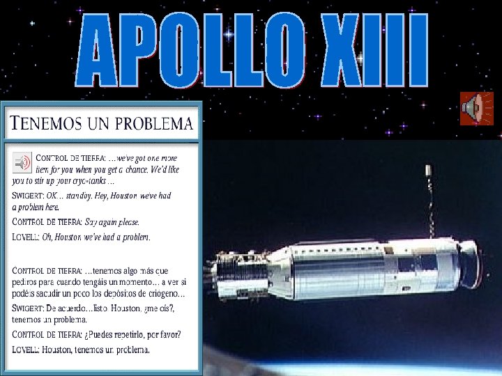APOLLO 13 Abril de 1970. Se lanza el APOLLO 13 tripulado por Lovell, Maise y Swigert. Con él estaba previsto el tercer alunizaje del programa. Sin embargo, al cuarto día de navegación sobrevino una explosión a bordo del Módulo de Servicio que cortó el suministro de oxígeno y de energía eléctrica al Módulo de Mando. Tuvieron que apagar el CM y pasar los tres al LM con el fin de usar la energía de éste para sobrevivir. El alunizaje fue suspendido y toda la atención se centró en poder hacer regresar a los tres hombres con vida. El viaje, tras múltiples situaciones angustiosas, que últimamente han sido narradas en una película, culminó con el rescate de los astronautas