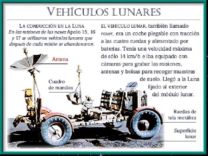 APOLLO 17 Cernan, Evans y Schhmitt, en Diciembre de 1972 realizaron la sexta y última misión de alunizaje. La misión tuvo una duración de 12 días, 13 horas y 52 minutos. Fue la última del proyecto. Alunizó el día 11 en el valle de Taurus-Littrow. Realizaron 3 salidas de la nave con una duración de 22 horas y 4 minutos. Schmitt fue el primer astronauta científico (geólogo). Dejaron instaladas 6 estaciones automáticas de investigación. Recorrieron con el Rover un total de 30, 5 km. , permaneciendo sobre la superficie lunar, 75 horas y en su órbita, 17 horas. Regresaron el día 19 trayendo 110, 4 kg de material.