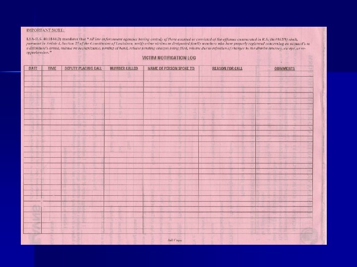 Pink Copy n By law, it is the responsibility of the jail to notify the victim of the offender’s release It’s the LAW R. S. 46: 1844 (3)