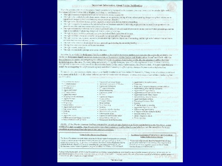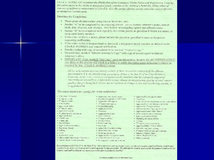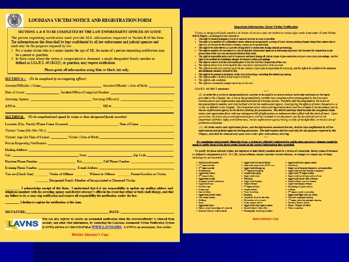 Formerly known as the “yellow form” n Act 783 of the 1999 Legislative Session mandated the use of the “yellow form” effective January 2000. Been in effect nearly 10 years n Many officers admit that they have never heard of the yellow form, the Louisiana Victim Notice and Registration Form. n