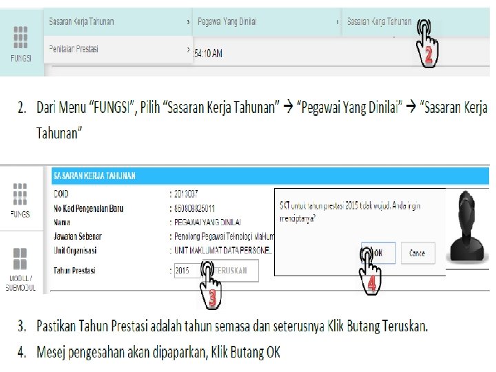 2. Kemudian, dipaparan seterusnya anda perlu click pada menu FUNGSI > Sasaran Kerja Tahunan > Pegawai Yang Dinilai > Sasaran Kerja Tahunan.
