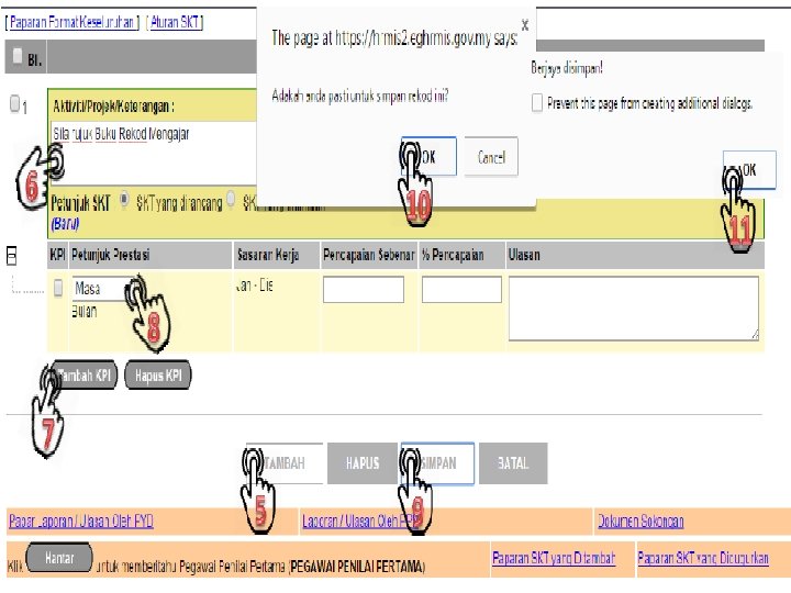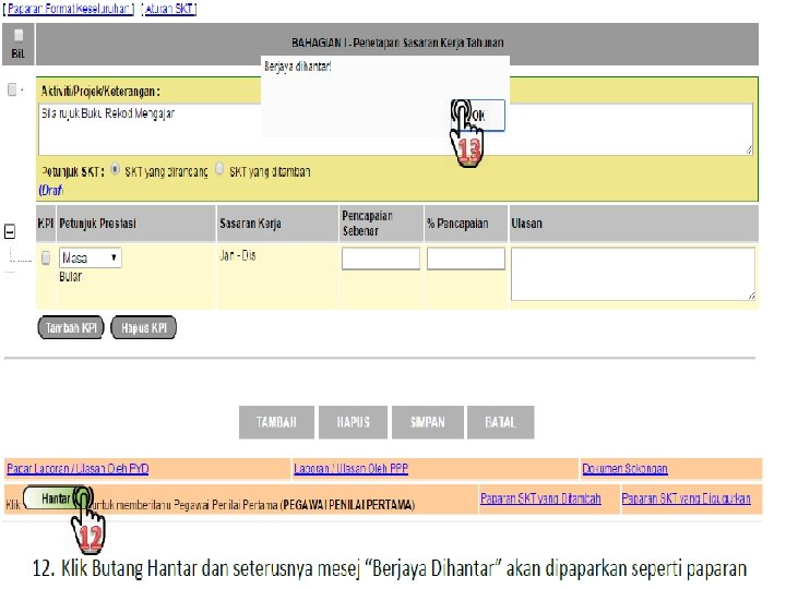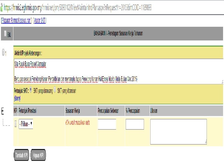 5. Klik Butang Tambah 6. Masukkan Aktiviti/Projek/Keterangan 7. Klik Butang Tambah KPI 8. Masukkan Petunjuk Prestasi , Sasaran Kerja dan Maklumat lain jika perlu 9. Klik Butang Simpan dan seterusnya mesej pengesahan akan dipaparkan. Klik Butang OK pada paparan 10 dan 11