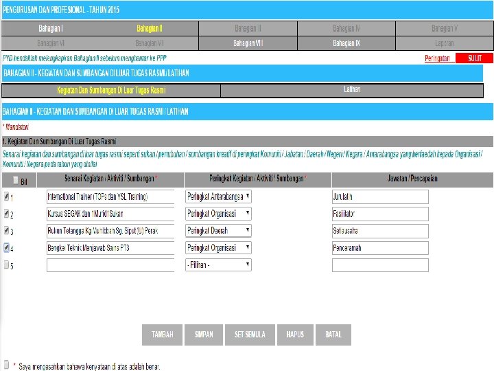 Ruangan yang perlu diisi untuk Kegiatan Dan Sumbangan Di Luar Tugas Rasmi • Ruangan yang perlu diisi untuk Latihan