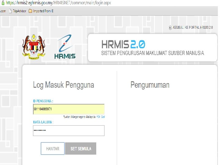 Laman web HRMIS 2. 0 : https: //hrmis 2. eghrmis. gov. my/HRMISNET/common/ main/login. aspx