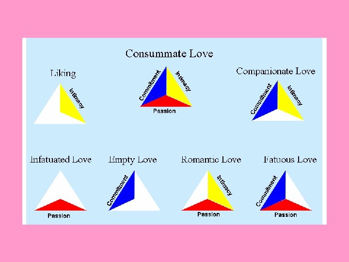 Three sides to the love triangle • Intimacy is defined as feelings of being close to and bonded with a partner. It requires exposing vulnerabilities. • Passion refers to the arousal you experience toward your partner, including sexual attraction. • Commitment consists of making two decisions; one, that you love your partner, and two, that you desire to maintain that love and stay with your partner. It is a long-lasing and stable concern for the other.