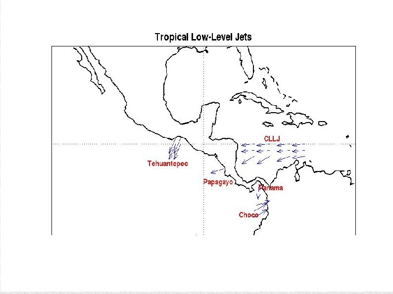 Conclusions The Caribbean Low Level Jet, Tehuantepec Jet, Papagayo Jet and Panama Jet, respond mostly to pressure gradients between the Atlantic and Pacific Ocean, accelerating the winds toward the Pacific. These pressure gradients have been explained by: 1) cold fronts from the North Hemisphere, push high pressure systems from midlatitudes to the tropics. 2) the annual cycle of the North Atlantic Subtropical High, which is more intense during the boreal summer. The Choco Jet owes its existence to the meridional temperature gradient between the Cold Tongue and western Colombia. The Papagayo Jet has cyclonic vorticity on the left side of its exit, which generates Ekman pumping and upwelling in the ocean, producing a dome in thermocline (the Costa Rica dome).