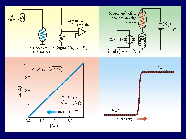 How well can a microcalorimeter measure energy? To answer this question, we need to specify the kind of thermometer. The best energy resolution, so far, has been obtained with resistor-based calorimeters, both semiconductor thermistors (the pioneering technology) and superconducting transition-edge sensors. d. T ––> d. R Sensitivity a = d log R / d log T Considerations for resistive thermometers: • All resistors have Johnson noise. • In order to measure the change in resistance as a change in current or voltage, the sensor must be electrically biased, resulting in Joule heating.