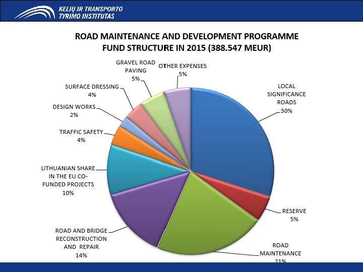 ROAD PAVEMENTS 34 % Gravel roads of the whole Lithuanian state road network TOTAL Asphalt Gravel Other 21 242 km 13 895 km 7 267 km 80 km (100%) (65%) (34%) (1%)