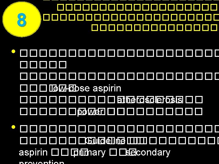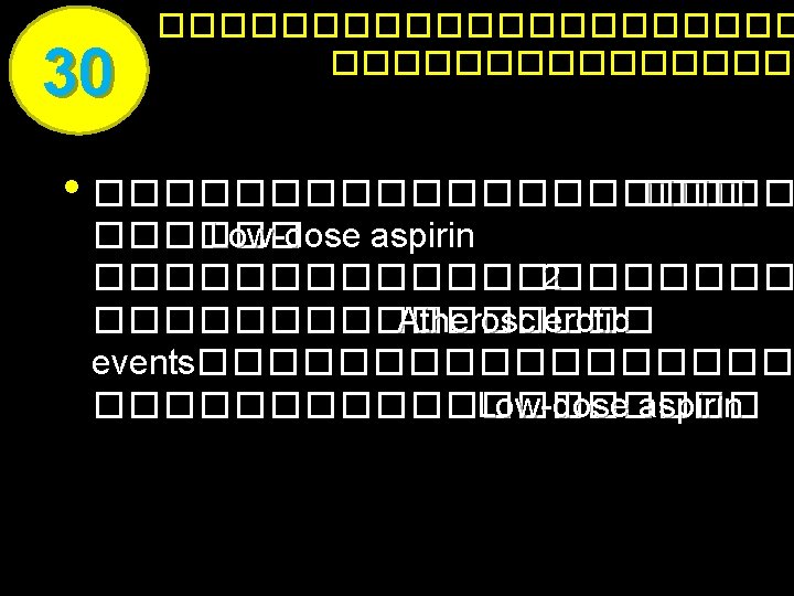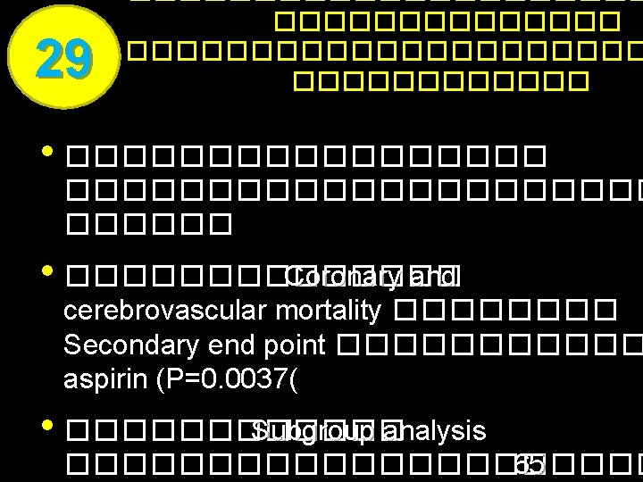 Comment • This trial; the sample size was the largest among the previous primary prevention studies in respect to the number of diabetic patients enrolled. • However, no difference was found in the effect of aspirin on the primary end point or most secondary end points. • A benefit of low-dose aspirin on the primary end point also was suggested in the subgroup of patients aged 65 years or older, which had a significant 32% relative reduction in total atherosclerotic events (P=. 047).
