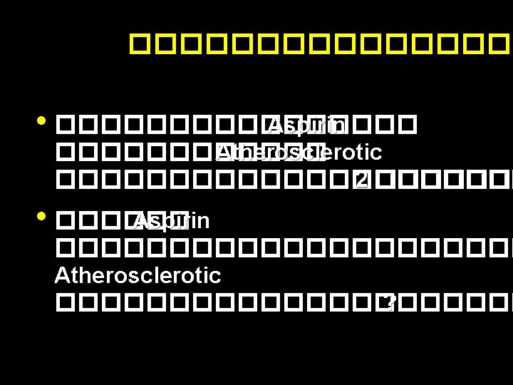 Adverse Events • No difference between aspirin group (10 patients) and nonaspirin group (7 patients) for composite of hemorrhagic stroke and severe GI bleeding – 4 cases of severe gastrointestinal (GI) bleeding that required transfusion in aspirin group – 6 hemorrhagic strokes (1 fatal) in aspirin group and 7 hemorrhagic strokes (4 fatal) in nonaspirin group