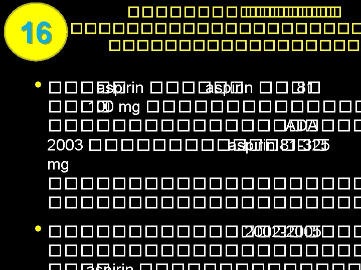 15 ����������� • Enrolled patients were randomly assigned to the aspirin group or the nonaspirin group by nonstratified randomization from a random number table. • The study center prepared the sealed envelopes with random assignments and distributed them by mail to the physicians in charge at the study sites.