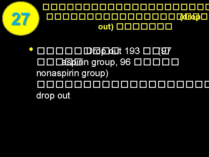 Sample size calculation • Based on a 2 -sided α level of. 05, a power of 0. 95, an enrollment period of 2 years, and a follow-up period of 3 years after the last enrollment. • We estimated that 2450 patients would need to be enrolled to detect a 30% relative risk reduction for an occurrence of atherosclerotic disease by aspirin.