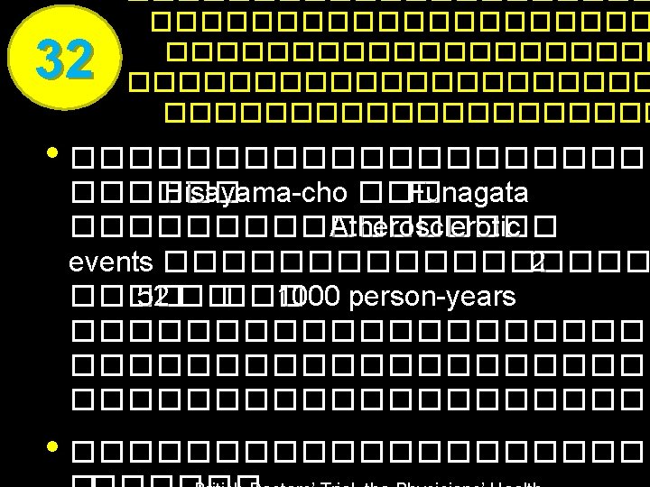 Sample size calculation • The incidence of cardiovascular death 7. 5, myocardial infarction 7. 5, and cerebrovascular events 8. 0 events per 1000 patients-year (Hisayama-cho study and Funagata study). • The atherosclerotic events, including peripheral arterial disease, was suggested to be 3 times (HOT study). • Discounted 25% of the estimated 69 events that were expected to occur and estimated that 52 events per 1000 patients-year.