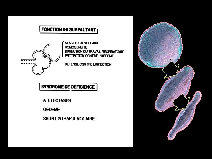 Normal lung aereation, thin septa Generalized atelectasis, leukocyte infiltration, thick septa, hyaline membranes