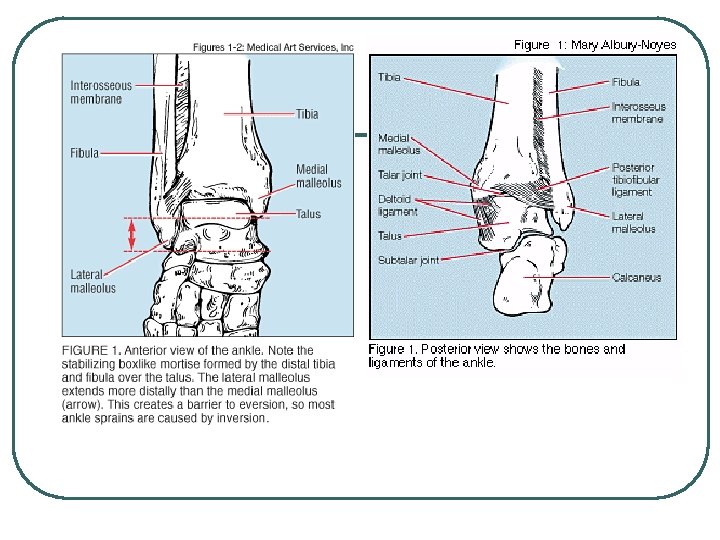 Ankle Sprains l l Most common athletic injury. 25% of all injuries. The risk of ankle sprains varies with the sport • 21 -53% basketball, 17 -29% soccer, 25% volleyball. Ankle sprains account for 10% to 15% of all lost playing time The medial malleolus is shorter than the lateral mallelous so there is naturally more inversion than eversion.
