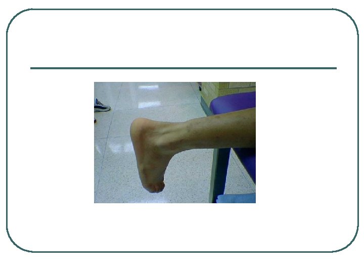 Classification of Sprains l l 1 st Degree: • • Stretching of the ATFL little or no edema tenderness maintain function. 2 nd Degree • • • Partial tear of the ATFL and/or CFL moderate edema some function loss l 3 rd Degree • • • Complete tear ATFL, CFL, and/or PTFL total loss of function significant edema