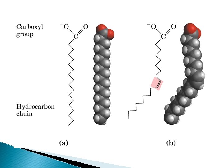 ÁCIDOS GRASOS INSATURADOS Son aquellos que presentan al menos un enlace doble C =C Este enlace produce un quiebre en la molecula que aumenta su flexibilidad A veces también enlace triple C C Ejemplos : ◦ ácido oleico ◦ ácido araquidónico