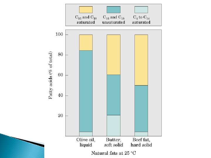 Grasas y aceites La longitud de la cadena carbonada y la cantidad de enlaces dobles (o grado de saturación) de los ácidos grasos influyen en el punto de fusión de las grasas o aceites. Esto determina que el lípido sea sólido (sebo, grasa) o líquido (aceite). Los ácidos grasos saturados se acomodan muy juntos, y forman una estructura sólida a temperatura ambiente. Sin embargo, los dobles enlaces permiten la flexibilidad de la cadena de ácidos grasos, por lo que se mantienen separados a temperatura ambiente, formando una estructura líquida. Los aceites vegetales tienden a contener más ácidos grasos insaturados, mientras que las grasas animales son ricas en ácidos grasos saturados. La siguiente tabla ejemplifica el porcentaje de los diferentes ácidos grasos que presentan en su composición algunas grasas animales y aceites vegetales:
