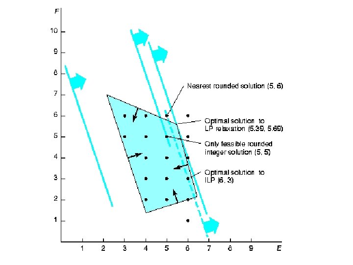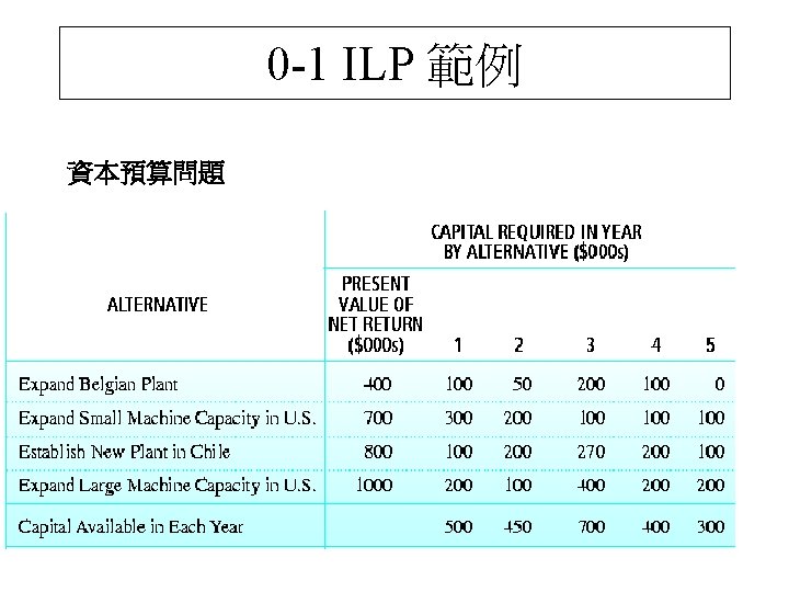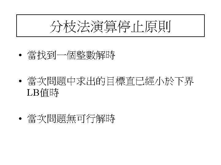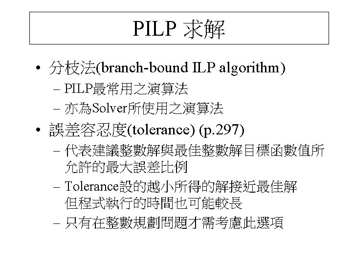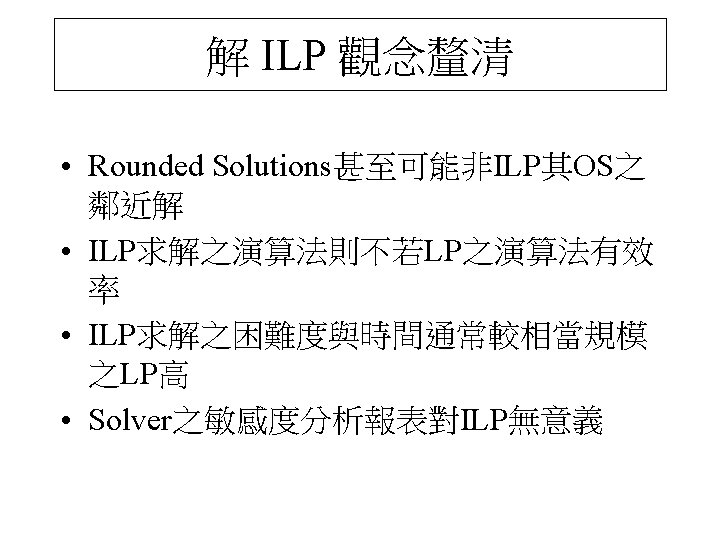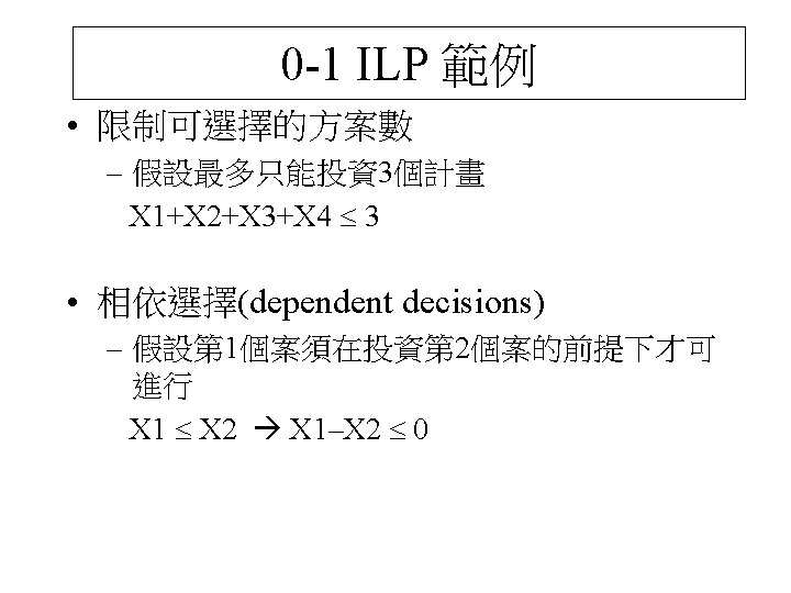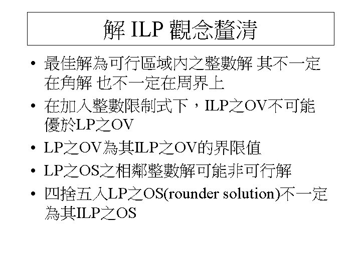 LPILP pure ILP PILP LPmixed ILP MILP 0 Slides: 15 Download presentation 整數LP(ILP)類型 • 純粹整數問題(pure ILP, PILP) • 混合整數LP(mixed ILP, MILP) • 0 -1整數LP(0 -1 ILP) 解 ILP 觀念釐清 • 範例— Max 18 E+6 F s. t. E+F 5 42. 8 E+100 F 800 20 E+6 F 142 30 E+10 F 135 E-3 F 0 E, F = integer 分枝法範例 Max. 8200 X+5100 Y Subjected to: X 2 Y 6 390 X+240 Y 1800 X, Y 0 Homework of Chapter 6 • T-F: 1, 2, 4, 5, 8, 10, 11 • Multiple choice: 12, 13, 14, 15, 16, 19, 20, 21, 30 • Problem: 6 -13, 6 -17