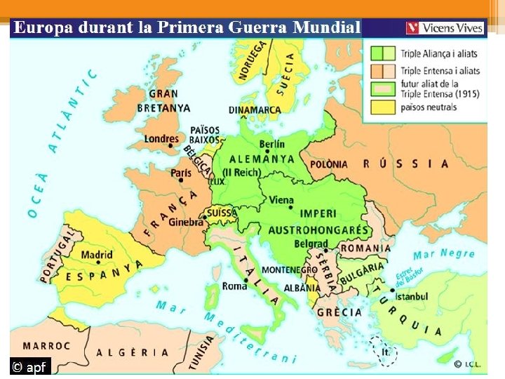 Esclat conflicte -28 juny 1914: assassinat hereu imperi autrohongarès. - protagonista: estudiant bosnià (Gavrilo Princip) amb relació a nacionalistes serbis. Últimatum d’A-H. Sèrbia NO accepta. - resultat: - Àustria-Hongria declara la guerra a Sèrbia - Rússia intervé per protegir Sèrbia - Alemanya declara la guerra a Rússia i a França - G. Bretanya declara la guerra a Alemanya quan aquesta envaeix Bèlgica per atacar França. -Finals de l’agost de 1914: - Triple Entesa era formada per França, Gran Bretanya i Rússia més un país petit com Sèrbia. - Bèlgica i Espanya van declarar-se neutrals (empresaris catalans venen als dos bàndols. Barcelona plena d’espies) - Bulgària, Romania i Turquia esperaven el moment idoni per prendre bàndol en el conflicte - altre bàndol format per Àustria-Hongria i Alemanya (TA) - Itàlia canvia de bàndol a canvi de promeses territorials.