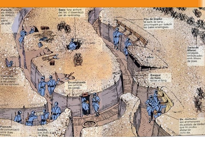 La Gran Guerra de moviments - FRONT OCCIDENTAL - Alemanya. Atac a França per Bèlgica i Luxemburg. Objectiu: no tenir 2 fronts oberts - PLA SCHLIEFFEN (atac ràpid) - Bèlgica s’havia declarat neutral !!! - principi setembre 1914 alemanys a 40 km de París -Reacció aliats: batalla del Marne ( 6 – 13 setembre 1914) FRONT ORIENTAL - Ofensiva russa. Batalla de Tannenberg. Derrota russa. Alemanys desplacen soldats. Bé victòria Marne. - Avenç ràpid alemany. - reacció russos: arriben a fronteres de l’imperi austríac Guerra de trinxeres (1914 -1916) -Fronts immòbils. - Front occidental: trinxeres de Suïssa al mar del Nord. Durs combats. Molts morts - necessitat de nous aliats: - 1915. Itàlia passa als aliats (TE). Bulgària i Imperi Turc a favor d’imperis centrals -1916. Ofensiva alemanya per trencar front francès - batalla de Verdun. Guanya França. Molts morts